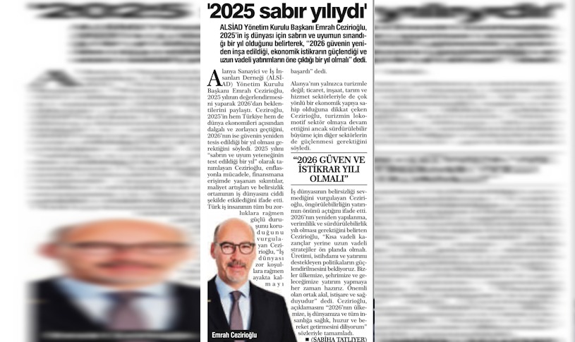 Alanya Sanayici ve İş İnsanları Derneği (ALSİAD) Yönetim Kurulu Başkanı Emrah Cezirioğlu, 2025 yılının değerlendirmesini yaparak 2026’dan beklentilerini paylaştı. Ceziroğlu, 2025’in hem Türkiye hem de dünya ekonomileri açısından dalgalı ve zorlayıcı geçtiğini, 2026’nın ise güvenin yeniden tesis edildiği bir yıl olması gerektiğini söyledi.